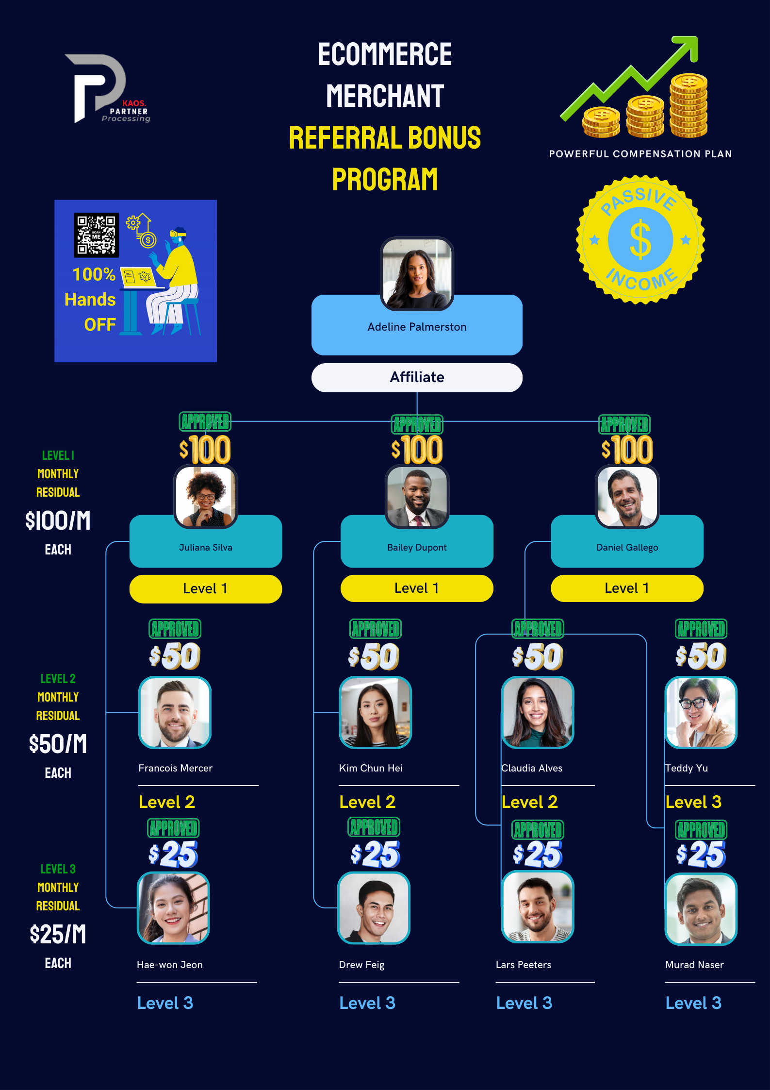If you aren’t quite ready for merchant approval, no worries. Earn a $100 referral bonus for each approved application, and another $100/m in residual income!